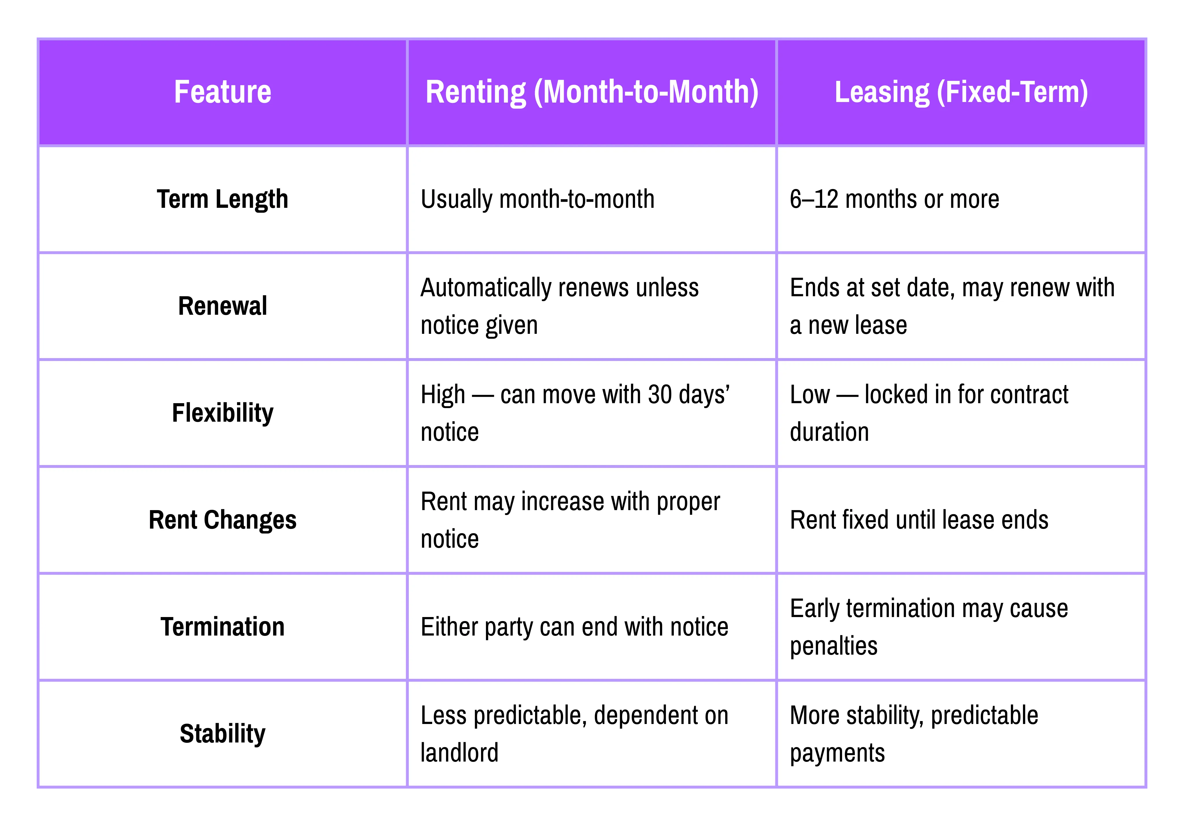 - Clear End Date: Once the lease expires, it does not automatically renew. You may sign a new lease, renegotiate updated terms, or switch to a month-to-month rental with landlord approval.