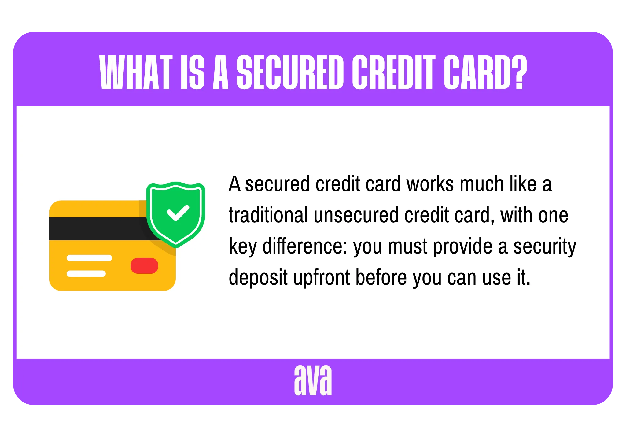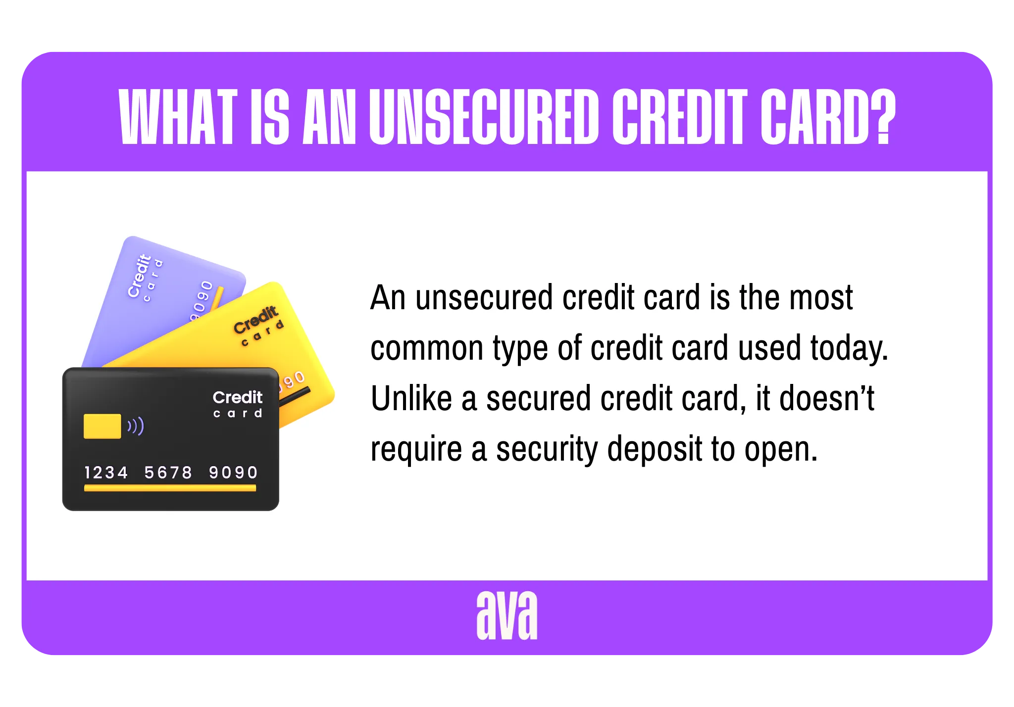 Bottom Line: Unsecured credit cards can be powerful tools for those with established credit history, offering higher limits and valuable rewards. However, they require more responsibility and stronger credit scores to unlock their full potential. If you don’t yet qualify for one, starting with a secured card — or using a credit builder tool like Ava Finance — may be the smarter path.