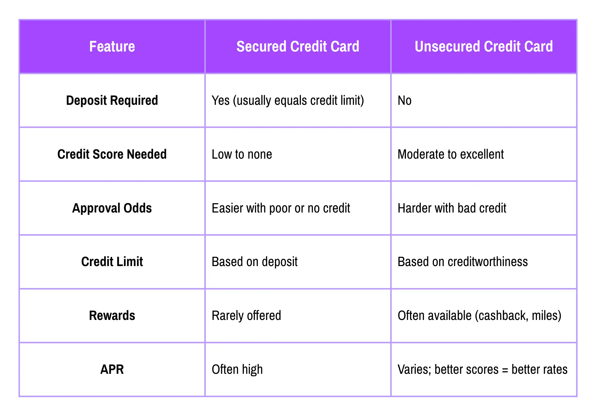 Because lenders take on more risk without a deposit, unsecured cards generally require at least fair to good credit to be approved. If your credit report shows negative items like late payments, charge-offs, or collections, you may face denials or only qualify for unsecured cards with less attractive terms (high APRs, low limits, or annual fees). - Risk of Overspending
